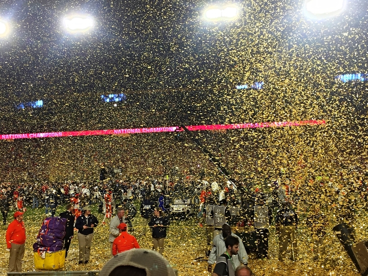 An overwhelming amount of confetti consumes the field, as Alabama upsets Clemson and wins the Championship